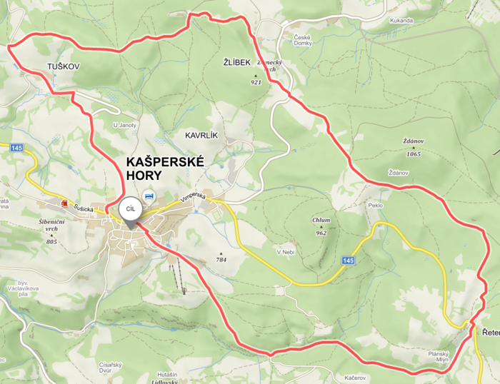 Zelené značení, délka 19,5 km (cca 6,5 h), převýšení 600 m, povrch: asfalt, lesní cesty a pěšiny.